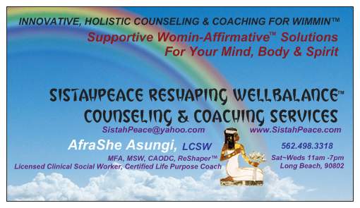 SistahPeace™ ReShaping™ WellBalance™ Counseling & Coaching Services - Long Beach ~ (((( * )))) ~ AfraShe Asungi, HHHAS, LCSW, MFA, MSW, CAODC